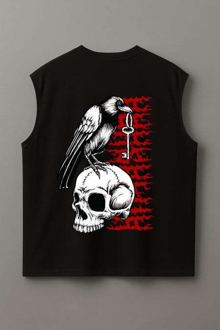 Arte exclusiva “Crow”: corvo com chave sobre o crânio — liberdade, desafio e renascimento num traço agressivo.